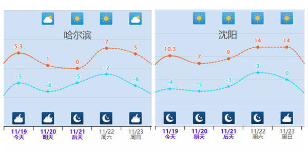 特别是东北地区多地,升温最为明显,22日至23日最高气温将会较常年11月下旬偏高10℃左右,像哈尔滨22日最高气温7℃,长春22日最高气温8℃,沈阳22日最高气温可达14℃。